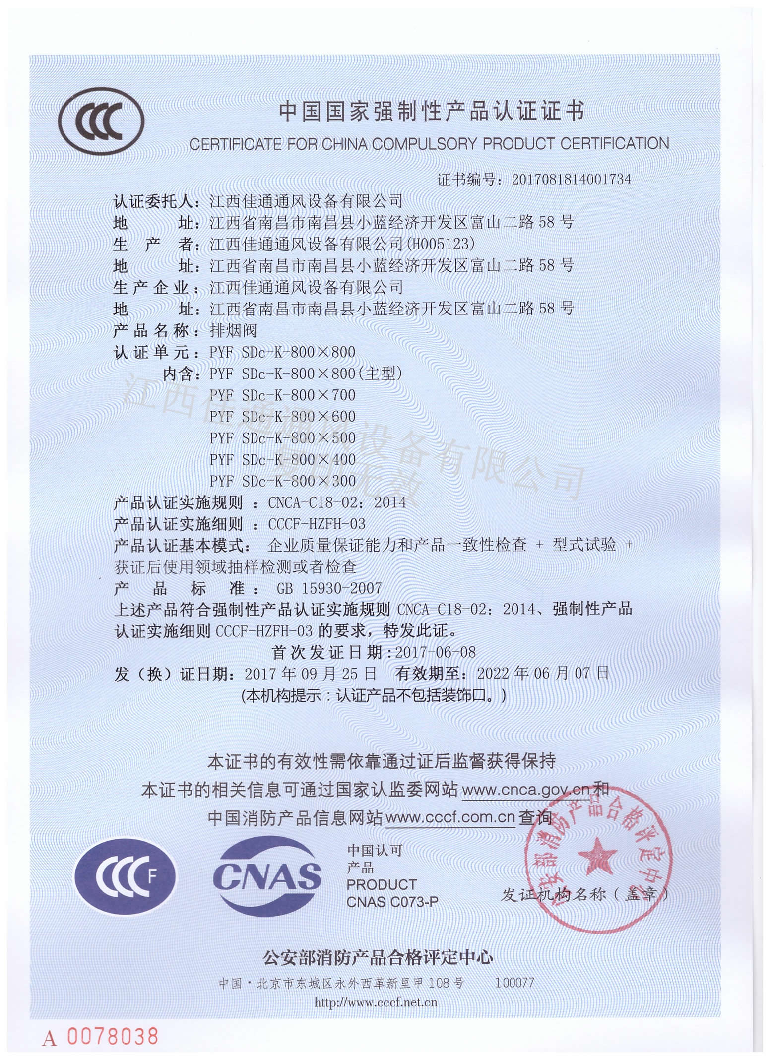 消防3C認(rèn)證證書排煙閥800×800