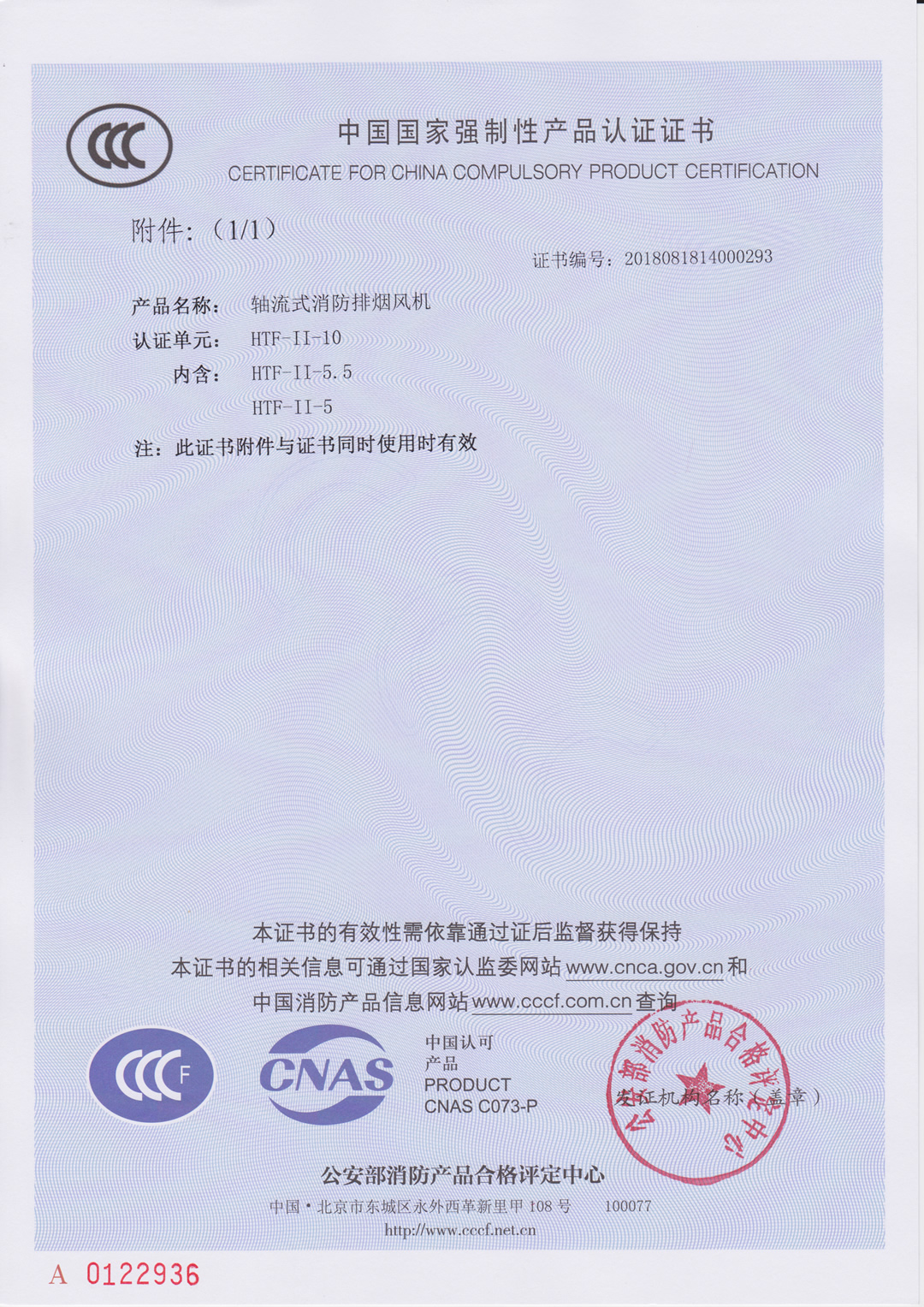 軸流式消防排煙風機(雙速)HTF-II-10(分型)消防3C認證證書