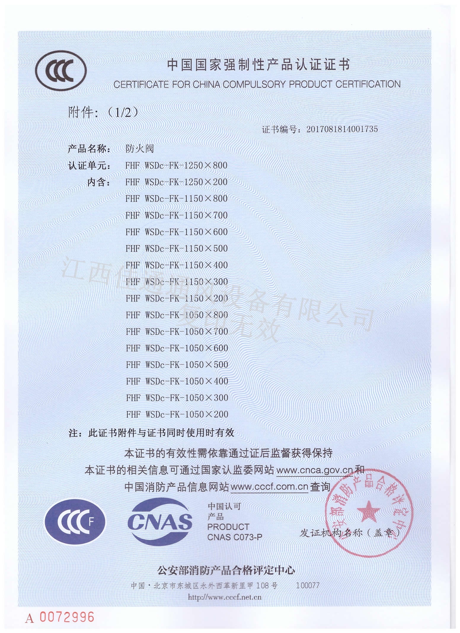 消防3C認(rèn)證證書防火閥1250×800(分型1)