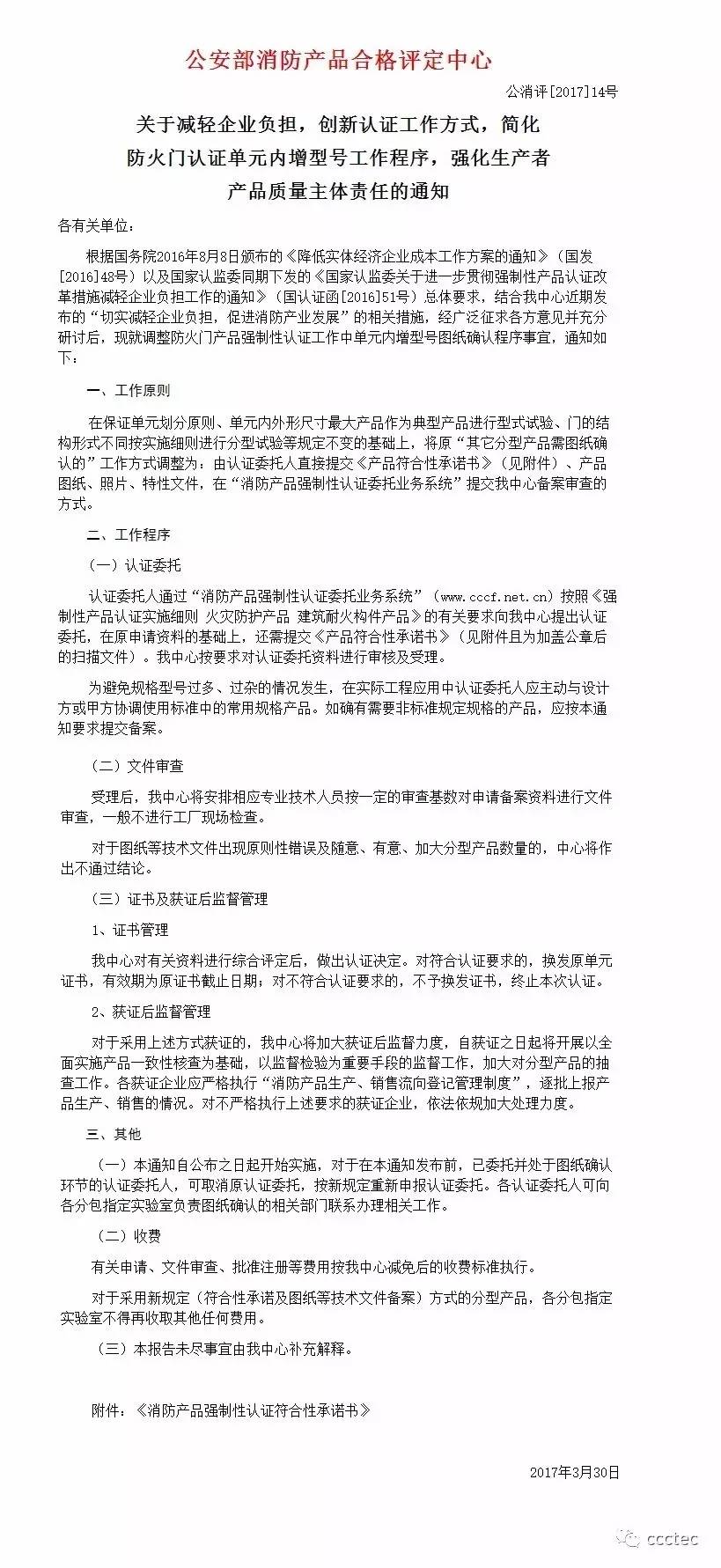 關(guān)于減輕企業(yè)負(fù)擔(dān),創(chuàng)新認(rèn)證工作方式,簡化防火門認(rèn)證單元內(nèi)增型號(hào)工作程序,強(qiáng)化生產(chǎn)者產(chǎn)品質(zhì)量主體責(zé)任的通知