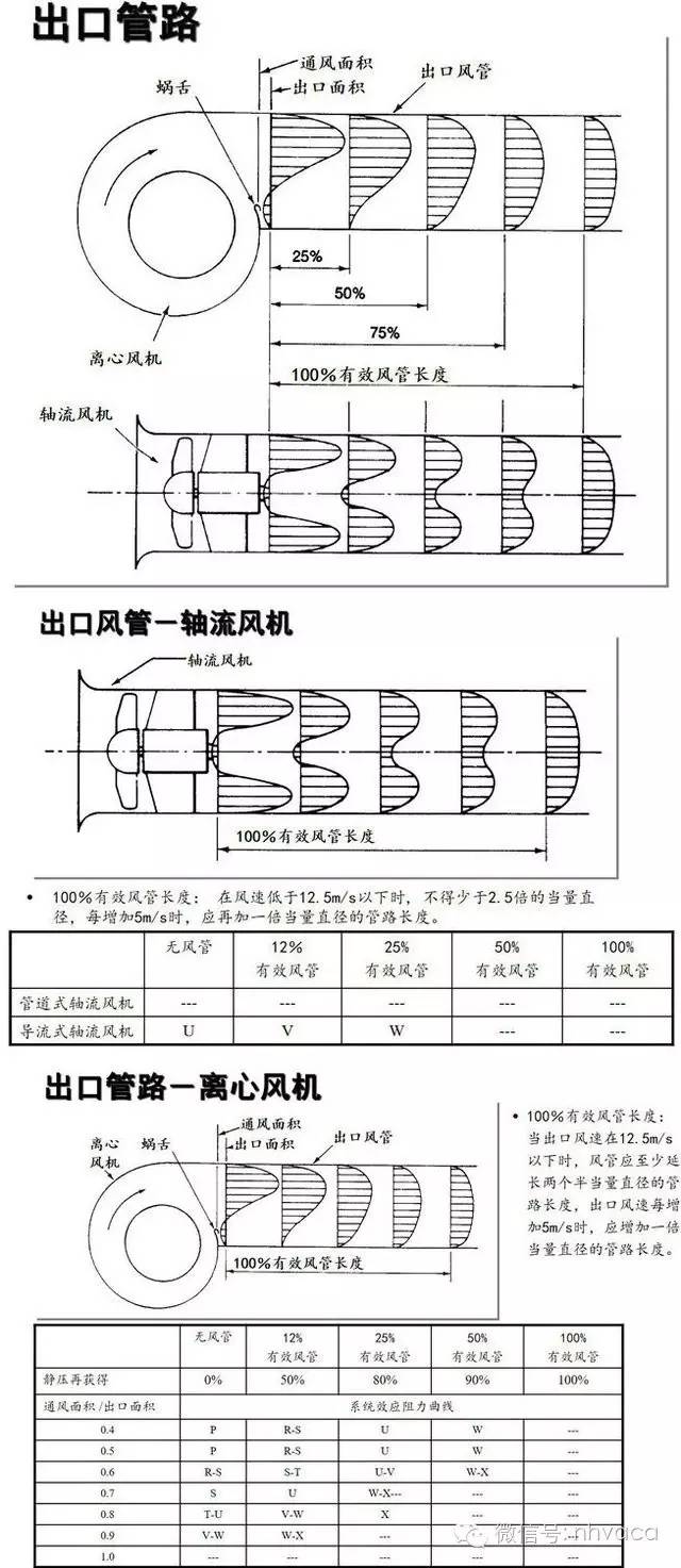 在很多系統(tǒng)中,考慮使用比風(fēng)機(jī)出口大的一段出口風(fēng)管是合適的。在這些情況下,將一些風(fēng)機(jī)動壓轉(zhuǎn)換成靜壓,使用于克服系統(tǒng)阻力的靜壓得以增加。