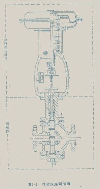 調(diào)節(jié)閥一般由執(zhí)行機(jī)構(gòu)和閥組件兩個(gè)部分組成。在有些場(chǎng)合可帶有閥門定位器、手輪機(jī)構(gòu)等附件。調(diào)節(jié)閥中最典型的產(chǎn)品——?dú)鈩?dòng)雙座調(diào)節(jié)閥的結(jié)構(gòu)如圖1-3所示。