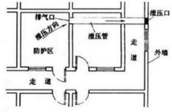若多個房間設(shè)計成一個氣體防護(hù)區(qū),其泄壓口的設(shè)置方法可照此進(jìn)行。 實例三如圖4所示,防護(hù)區(qū)沒有外墻,其泄壓口的設(shè)置方法為在防護(hù)區(qū)上部開設(shè)排氣口.排氣口面積與泄壓口面積相等,在外墻的適當(dāng)位置開設(shè)泄壓口,排氣口與泄壓口之間用一單獨設(shè)置的泄壓管相連,這樣就可以將防護(hù)區(qū)超壓的氣體直接排到建筑物外,真正做到符合消防規(guī)范的要求。