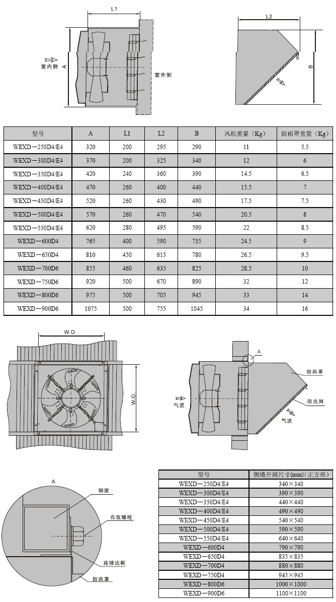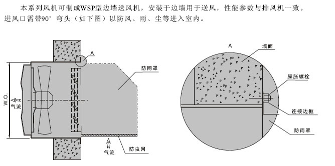 DWEX邊墻風(fēng)機(jī)又叫WEX邊墻風(fēng)機(jī),其采用先進(jìn)的前掠型葉片、低噪音的外轉(zhuǎn)子或內(nèi)轉(zhuǎn)子風(fēng)機(jī)專用電機(jī)直聯(lián)傳動(dòng),方形外殼設(shè)計(jì)可以方便地安裝在混凝土墻、磚墻或輕鋼壓型墻板上,方形防雨罩結(jié)構(gòu)牢固,外形美觀。具有噪聲低、風(fēng)量大、運(yùn)行可靠、性能參數(shù)范圍廣、安裝簡(jiǎn)便等特點(diǎn)。根據(jù)輸送介質(zhì)的要求,可制成防腐、防爆型。 DWEX(WEX)系列風(fēng)機(jī)一般用于邊墻壁式排風(fēng),配設(shè)45°防雨罩(或特殊制造成60°)和防蟲(chóng)網(wǎng)(夜間可防止昆蟲(chóng)循燈光飛入車(chē)間)??砂葱枰瞥蛇厜λ惋L(fēng)機(jī)型號(hào)為DWSP(WSP),配設(shè)90°防雨罩(防風(fēng)、雨、塵)和防蟲(chóng)網(wǎng)(夜間可防止昆蟲(chóng)循燈光飛入車(chē)間)。