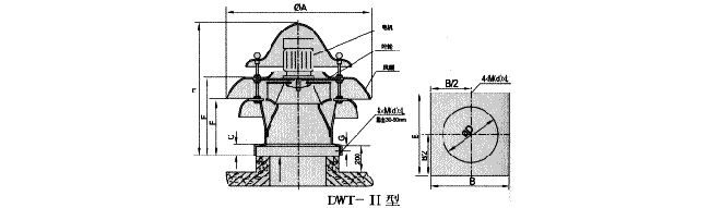 b、離心式屋頂風機:代號為DWT-II,型、DWT-III型二種型式,適用于風量較小而壓力要求較高的場合。