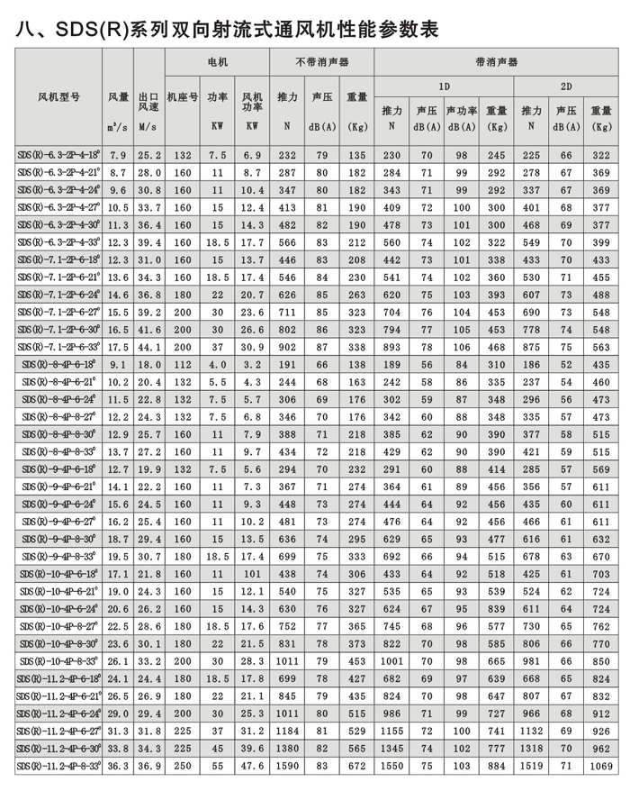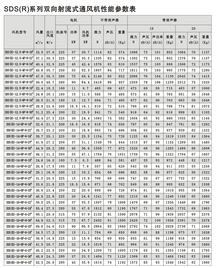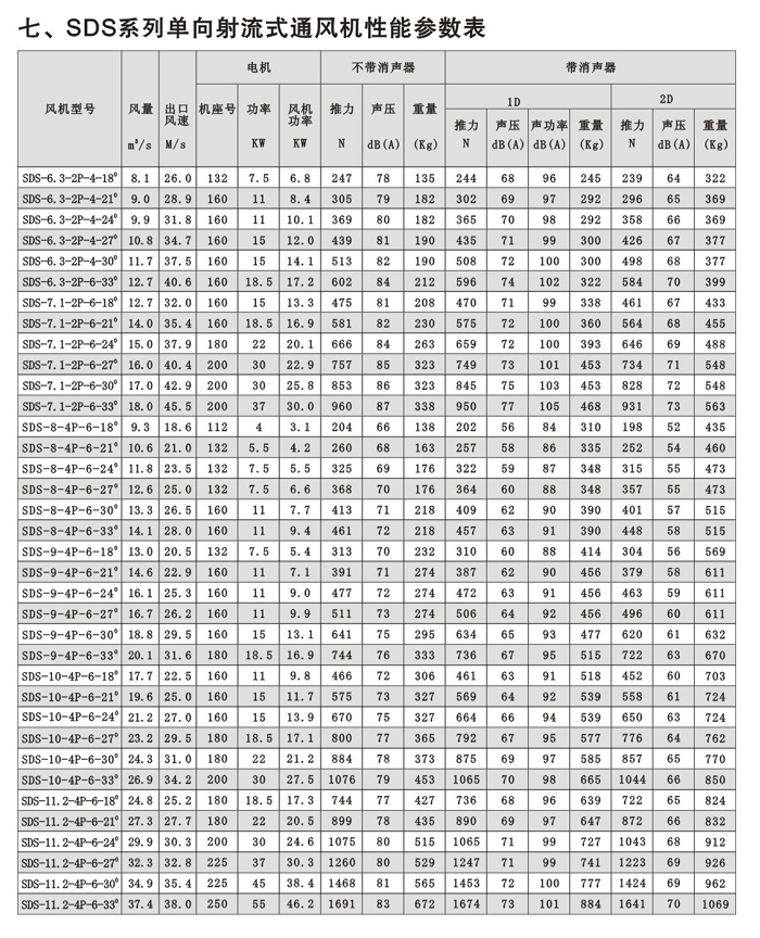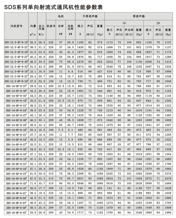 SDS系列射流風機規(guī)格自(1)400mm—①1600mm,分單向運轉軸流風機和可逆式(雙向)運轉軸 流風機二大類,最大推力有3500N,對任一負荷和工況均可選擇高效、低噪聲的風機。