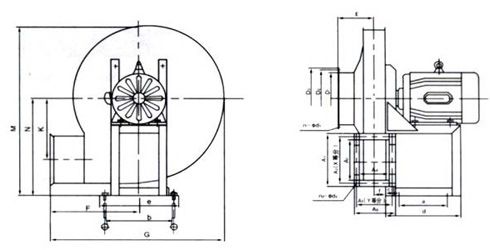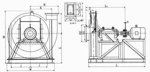 9-19、9-26系列高壓離心通風機為單吸入式,有No.4-16共13個機號.其中No:4-6:3傳動方式為A式傳動,No.7.1-16傳動方式為D式傳動