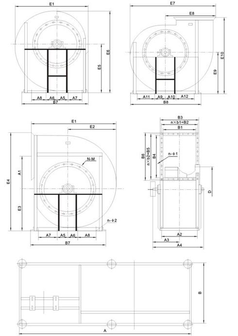 (九)、4-79系列14E-16E離心風(fēng)機(jī)外形尺寸表